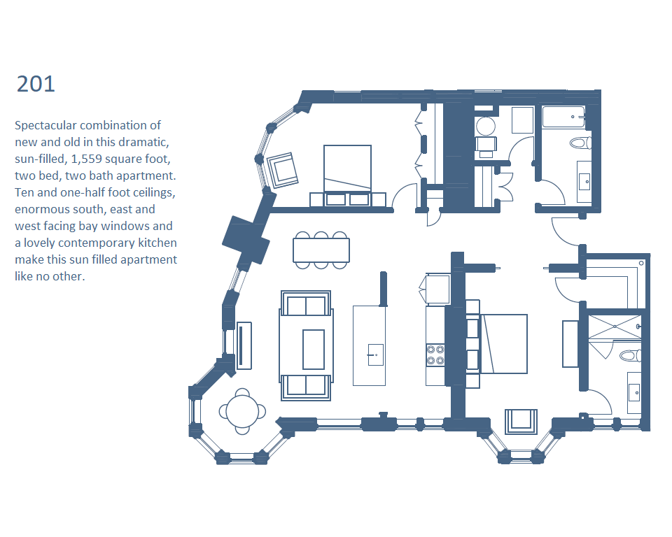 This 1,559 square foot, two bedroom, two bathroom apartment and see what the talk is about. The open concept kitchen with large pantry closet, living, and dining area provide plenty of space for fun, and features a corner bay / reading nook. You’re sure to enjoy the master suite, which features amazing walnut pocket doors and an en-suite bathroom. The second bed and bath could make for a perfect home office, guest room, and more.